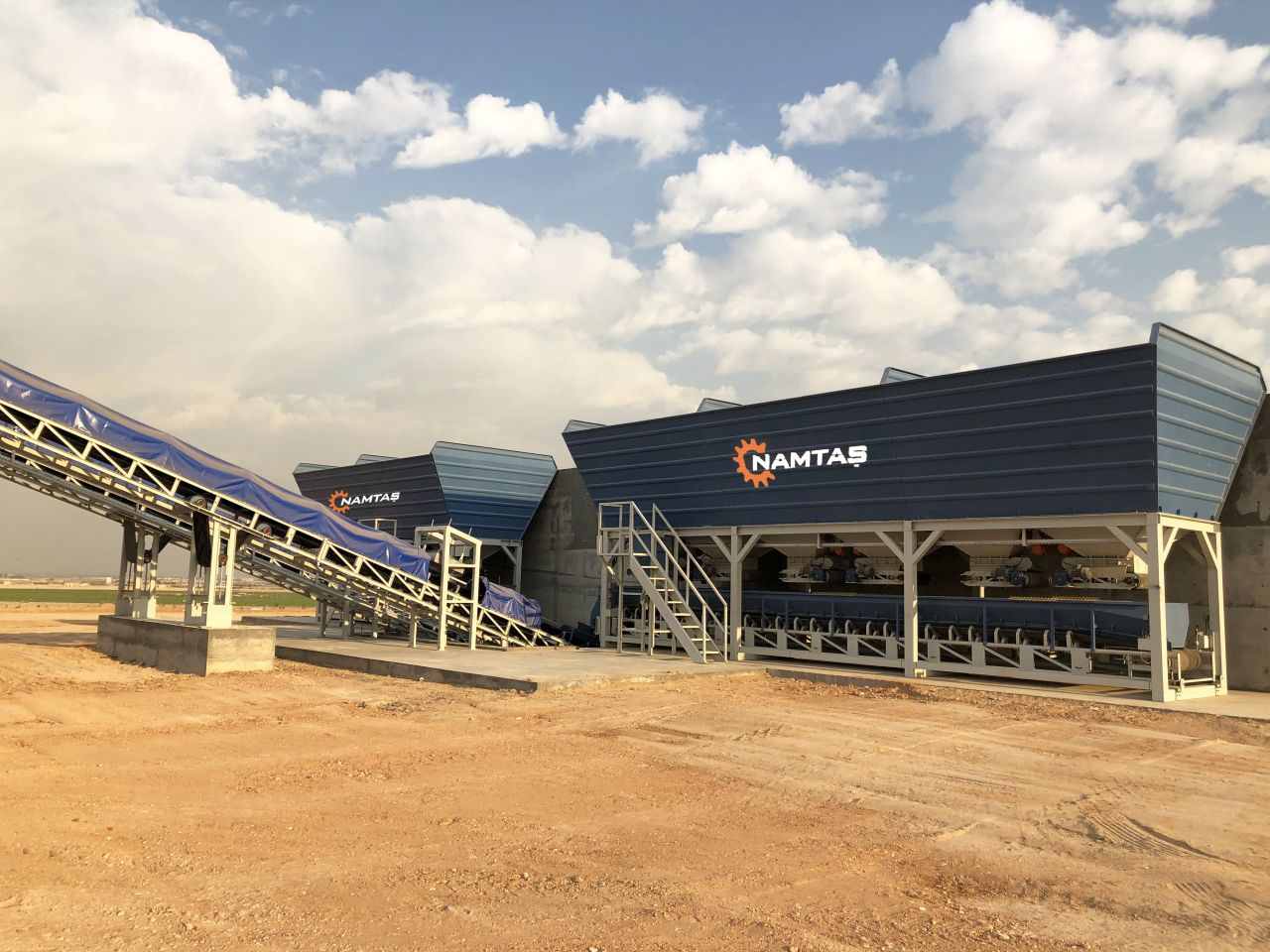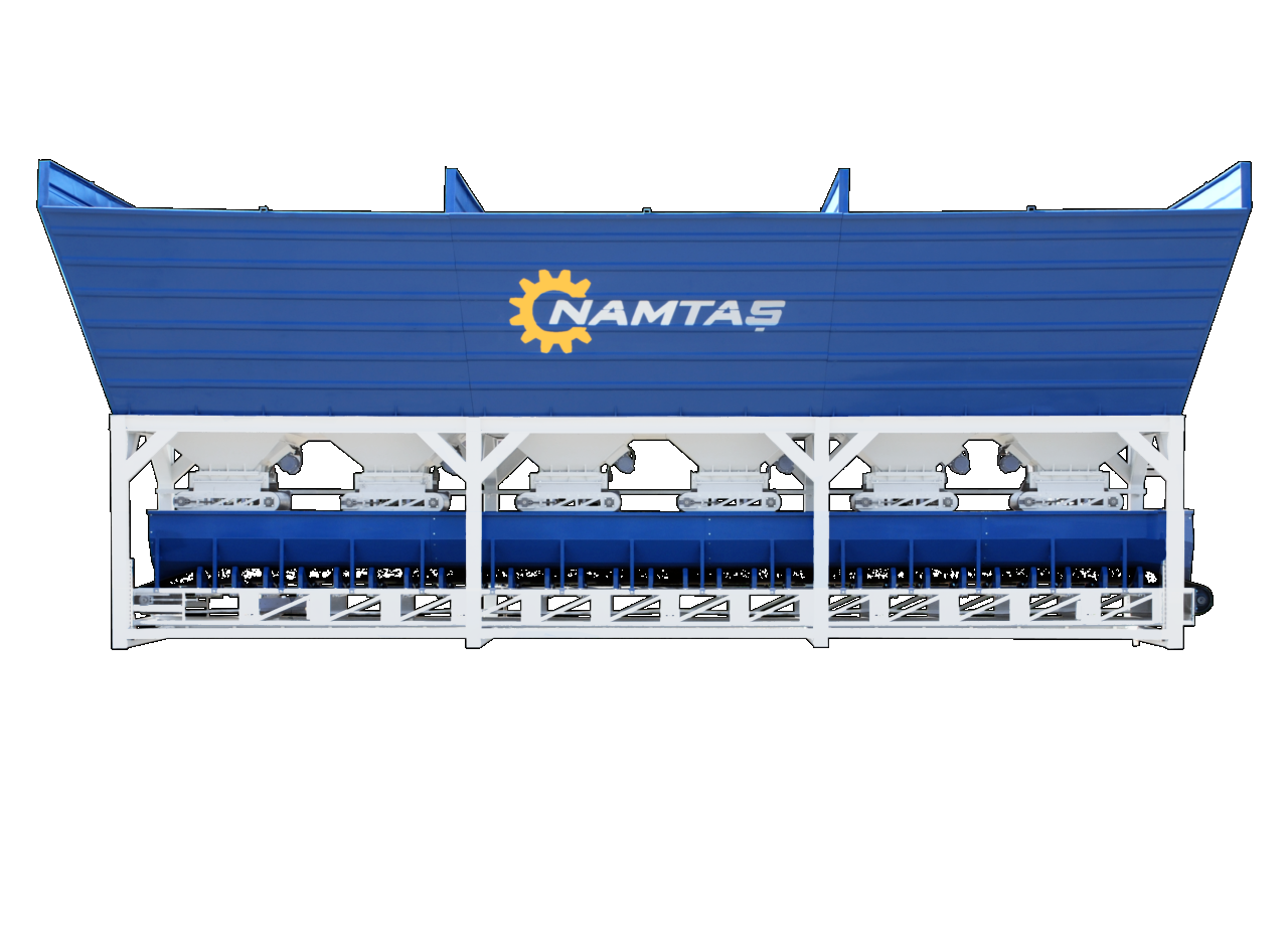 This system combines together aggregate bins with aggregate dosing and conveying solutions in a single robust steel frame structure. Namtaş manufactures modular aggregate bins with the capacity of 5-25 mᶟ each used for the storage of different types and sizes of aggregates. Aggregates are weighed automatically on the weigh belt conveyor or with the help of travelling weigh hopper. Fast and accurate batching is achieved by using high-precision load-cells.
